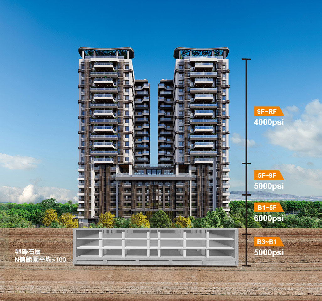 基地所在位置地質為「卵礫石層」,搭配本案是石門唯一SRC鋼骨&RC複合式結構,先天優良堅硬的地質加上後天穩固的建築結構,打造令人安心的傳世之作。