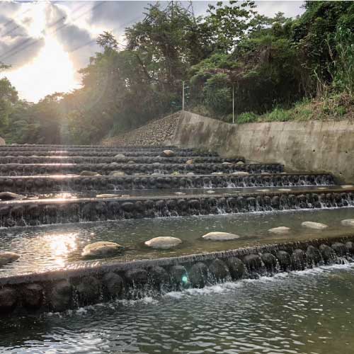 親子免費戲水景點,階梯式的千層瀑水深較淺,可以放心坐在石階上欣賞小朋友戲水的歡樂畫面。